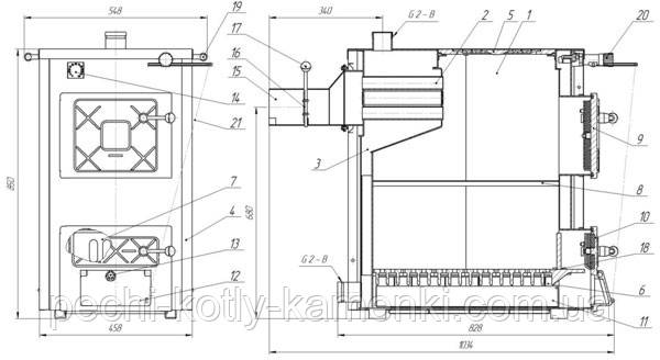 1 — топкова камера; 2 — трубчастий конвективний газохід; 3 - водяна сорочка; 4 - кожух; 5 — чавунна плита; 6 — камера збирання золи; 7 - шурувальні дверцята; 8 - куточок; 9 — верхні дверцята; 10 — нижні дверцята; 11 — попільник; 12 - заслінка; 13 - регулювальний гвинт; 14 — термометр; 15-патрубок димоходу; 16 — шибер; 17 — ручка, 18 — колосники; 19 — сушарка для рушників, 20 — регулятор тяги (купується окремо).